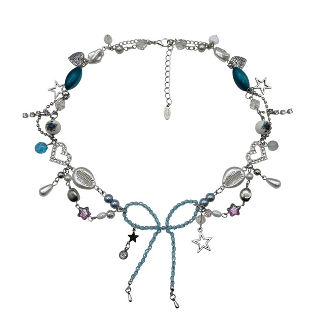 ビーズで作った水色のリボンが可愛らしいキュートなネックレス。 パールや星などのパーツを散らばせた、どの季節にもぴったりのアイテム。 サイズ: 43.5〜49cm ⚠︎全ての商品においてハンドメイドのため、強く引っ張ったり無理に力をかけると破損に繋がる可能性があります。 丁寧にお取り扱いいただけたら嬉しいです。 ご購入から1ヶ月以内に破損してしまった場合、無料で修理を致しますのでInstagram(@___v.a.c.a.n.c.e.s___)のDMにてご連絡下さい。