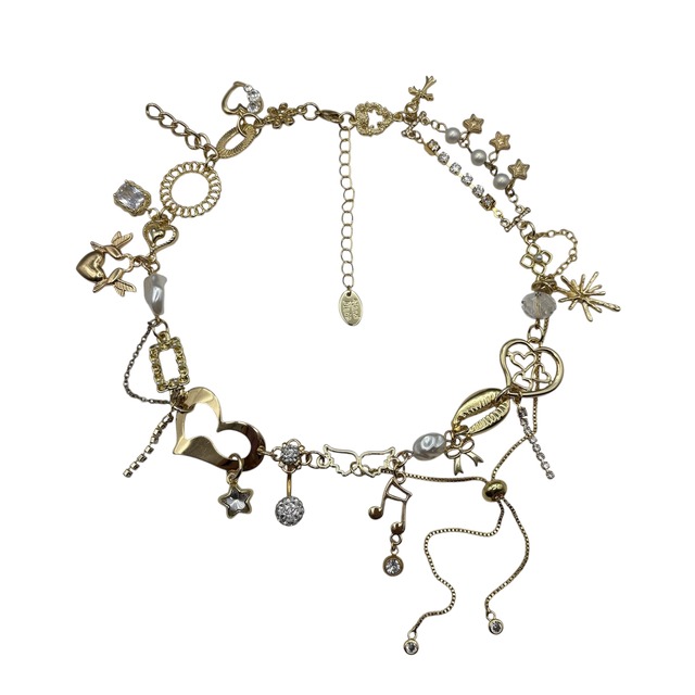 ゴールドのパーツをメインに繋げたゴージャスなネックレス。 ハートや音符などの可愛いパーツやへそピアスなどユニークやチャームをたくさんつけたアイテム。 フロントのアジャスターも長さを自由に変えられるのがポイント。 サイズ: 37〜42.5cm ⚠︎全ての商品においてハンドメイドのため、強く引っ張ったり無理に力をかけると破損に繋がる可能性があります。 丁寧にお取り扱いいただけたら嬉しいです。 ご購入から1ヶ月以内に破損してしまった場合、無料で修理を致しますのでInstagram(@___v.a.c.a.n.c.e.s___)のDMにてご連絡下さい。
