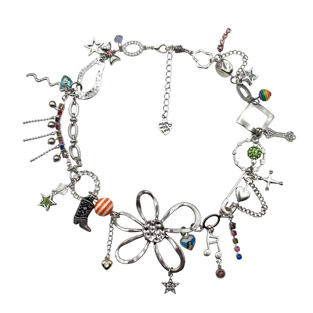 センターの大きな花のモチーフが印象的なネックレス。 シルバーをメインに、カラフルなチャームがいいアクセントになったキュートな一点。 サイズ: 39.5〜45cm ⚠︎全ての商品においてハンドメイドのため、強く引っ張ったり無理に力をかけると破損に繋がる可能性があります。 丁寧にお取り扱いいただけたら嬉しいです。 ご購入から1ヶ月以内に破損してしまった場合、無料で修理を致しますのでInstagram(@___v.a.c.a.n.c.e.s___)のDMにてご連絡下さい。