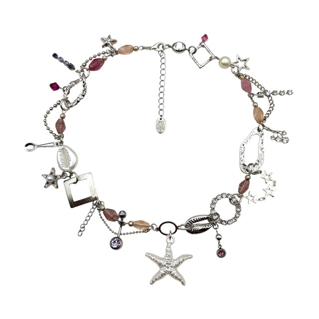 センターのヒトデ型のパーツが夏らしいアイテム。 シルバーのパーツをメインに、ピンクや紫のインドのガラスビーズがいいアクセントになったネックレス。 サイズ: 40.5〜46cm ⚠︎全ての商品においてハンドメイドのため、強く引っ張ったり無理に力をかけると破損に繋がる可能性があります。 丁寧にお取り扱いいただけたら嬉しいです。 ご購入から1ヶ月以内に破損してしまった場合、無料で修理を致しますのでInstagram(@___v.a.c.a.n.c.e.s___)のDMにてご連絡下さい。