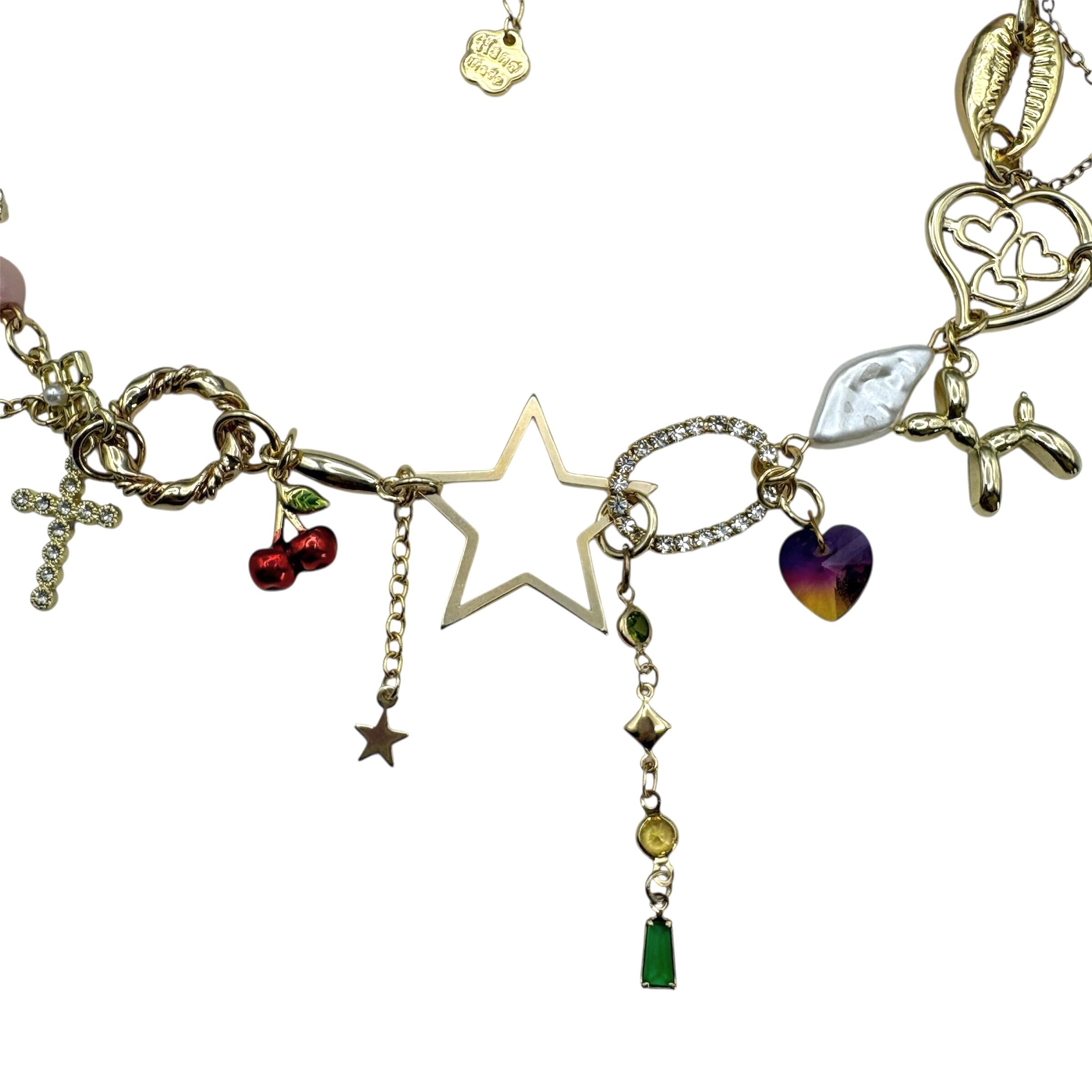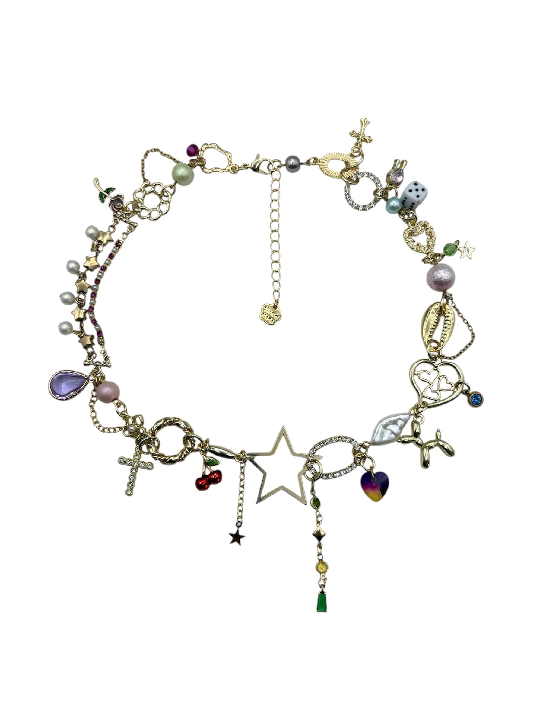 ゴールドのパーツをメインに繋げ、犬のバルーン型チャームやダイスなどユニークなパーツが可愛いネックレス。