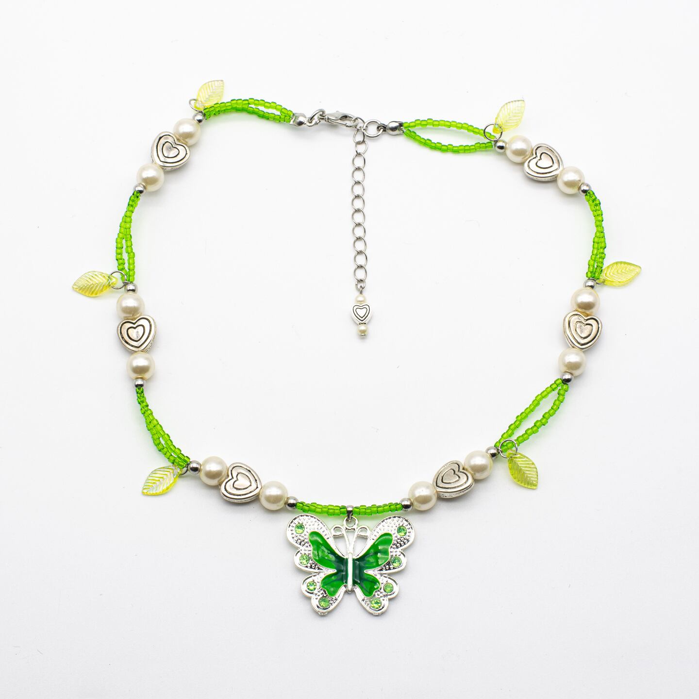 シルバーとグリーンの蝶が特徴的なネックレス。蝶にはグリーンのストーンがたくさんついていて超かわいい♡
