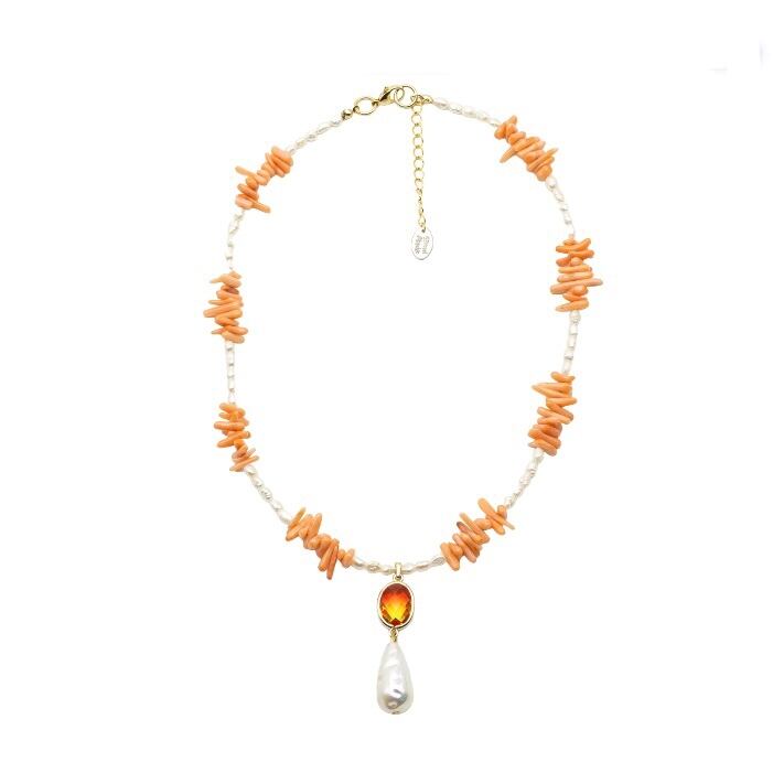 ペールサーモンの珊瑚ビーズと不揃いなパールが可愛いネックレス。センターのマンゴーカラーのチャームとオーロラに光るティアドロップ パールで大人っぽい雰囲気に。