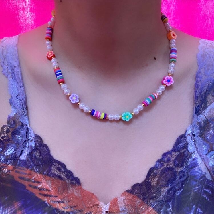 ポリマークレイとパールを繋げた、カラフルでいろんな服装に合わせやすいネックレス。