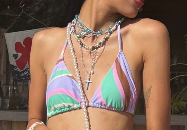 カラフルなパールを繋げ、接続部には大きなチェーンが付いているネックレス。センターフロントのジルコニアクロスはキラキラと輝いて存在感抜群。