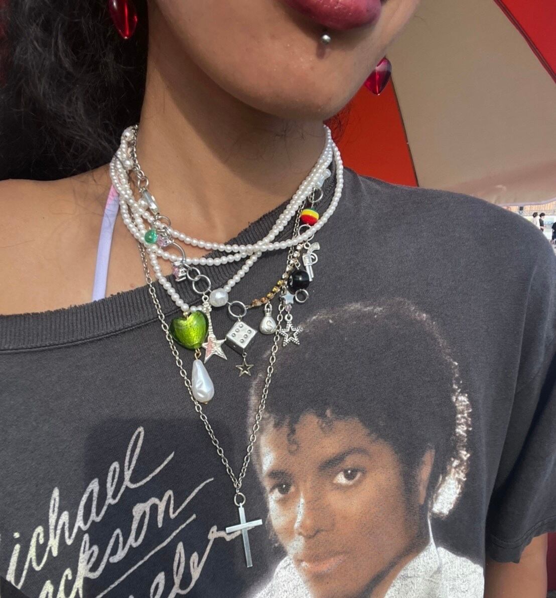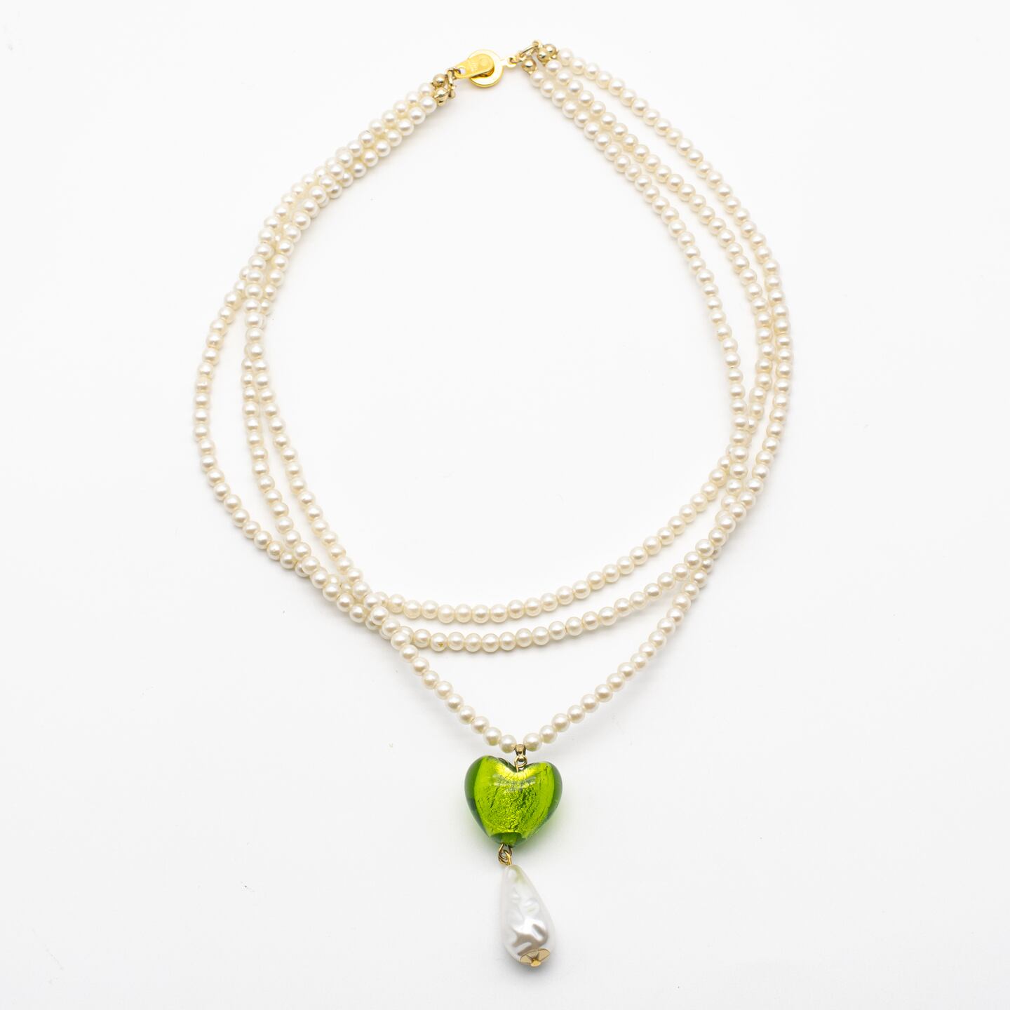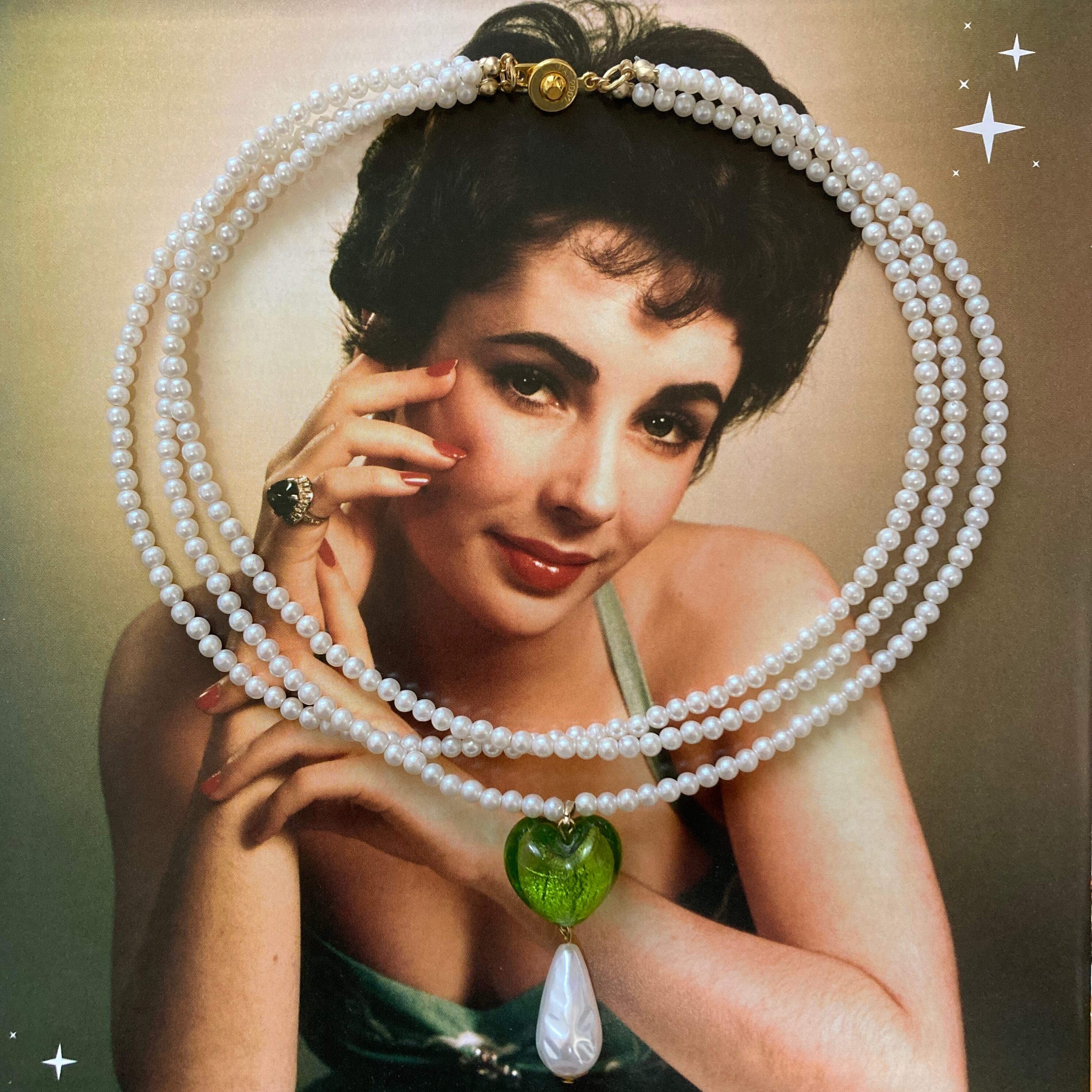 小さなパールを三重にした上品で大人っぽいネックレス。センターのガラスのハートとティアドロップ 型パールで可愛らしさをプラス♡