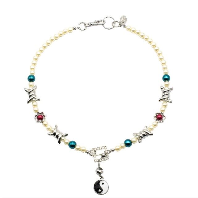 パールをメインに、鎖のパーツがアクセントになったネックレス。