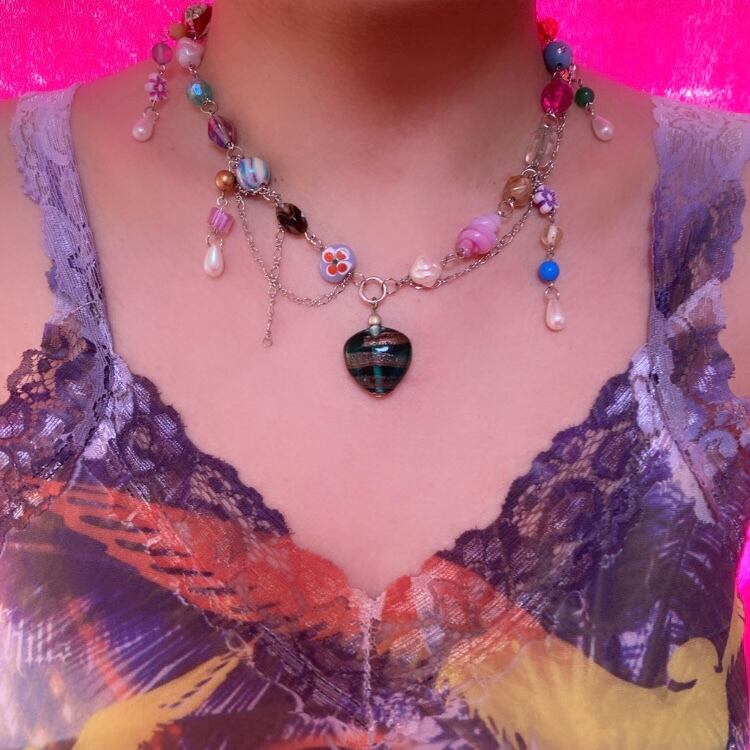 個性的なビーズを集め繋げたネックレス。