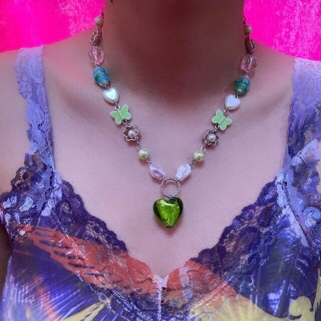 ライトグリーンのパーツをメインに繋げたまとまりのあるネックレス。