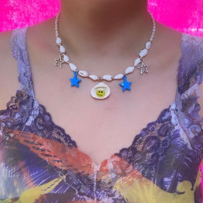 貝殻のビーズをメインとし、センターの貝にはニヤリと笑うニコちゃんがついた個性的なネックレス。