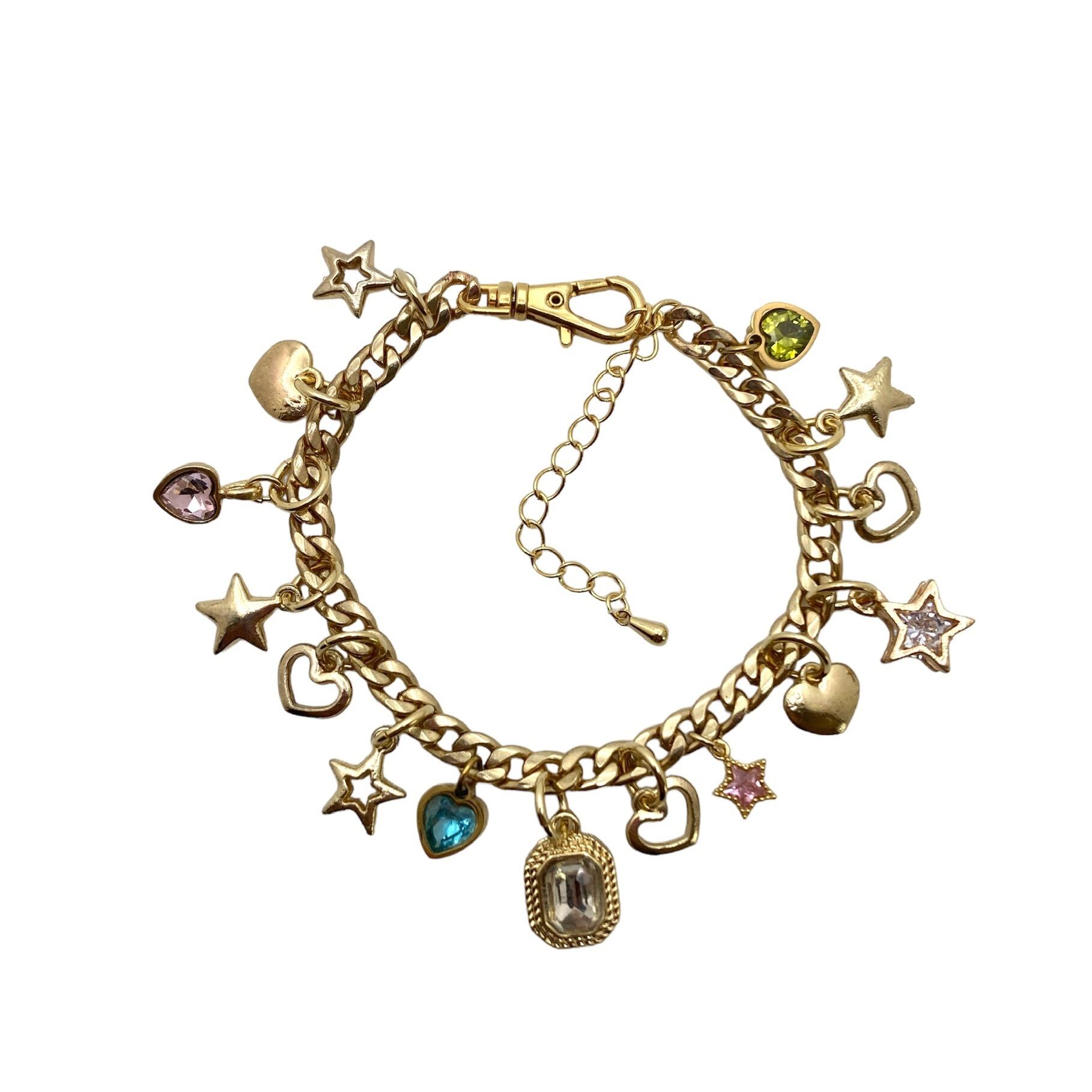 ゴールドのチェーンをメインにおしゃれなチャームをたくさんつけたブレスレット。