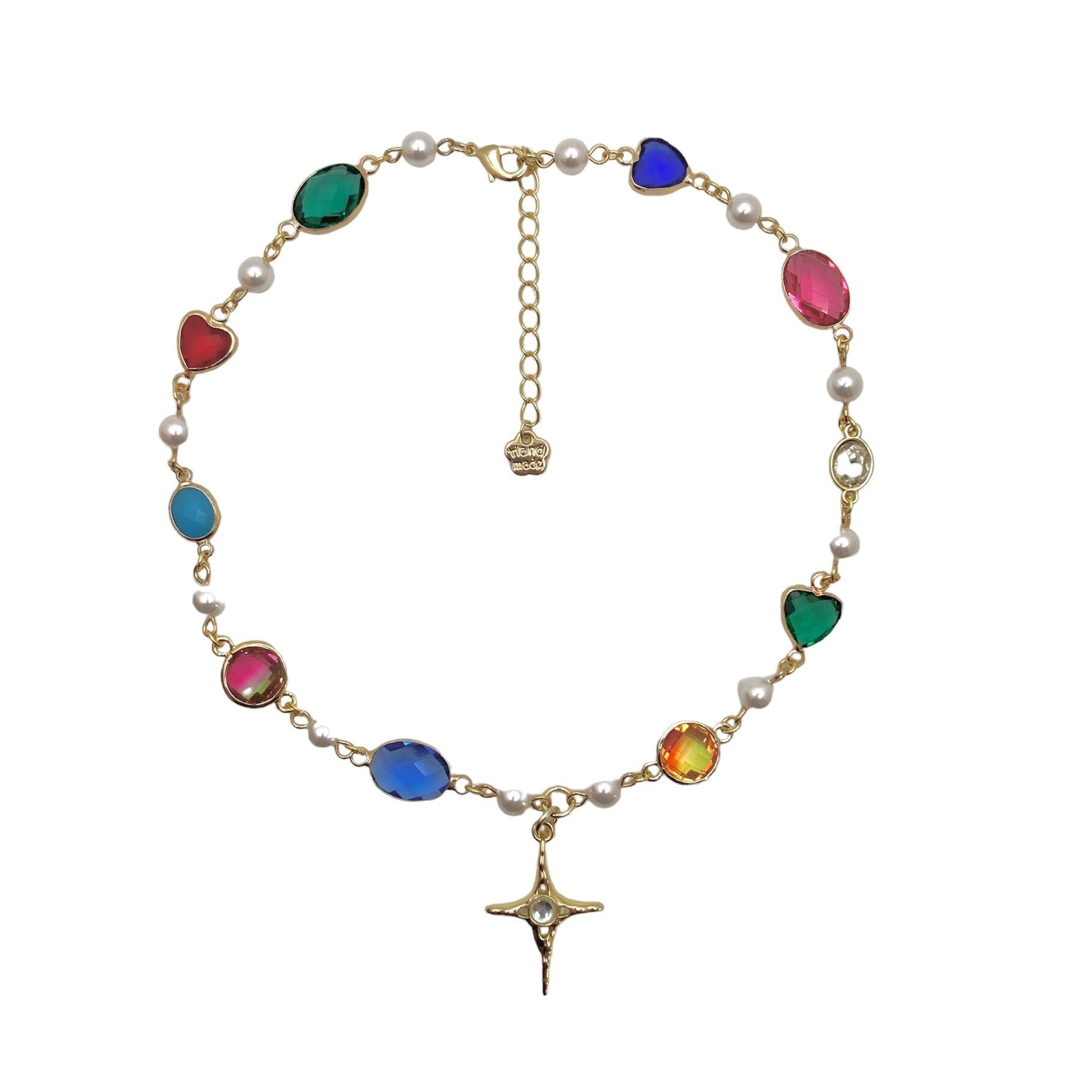 様々な色のビジュー風パーツをつなげたおしゃれなネックレス。