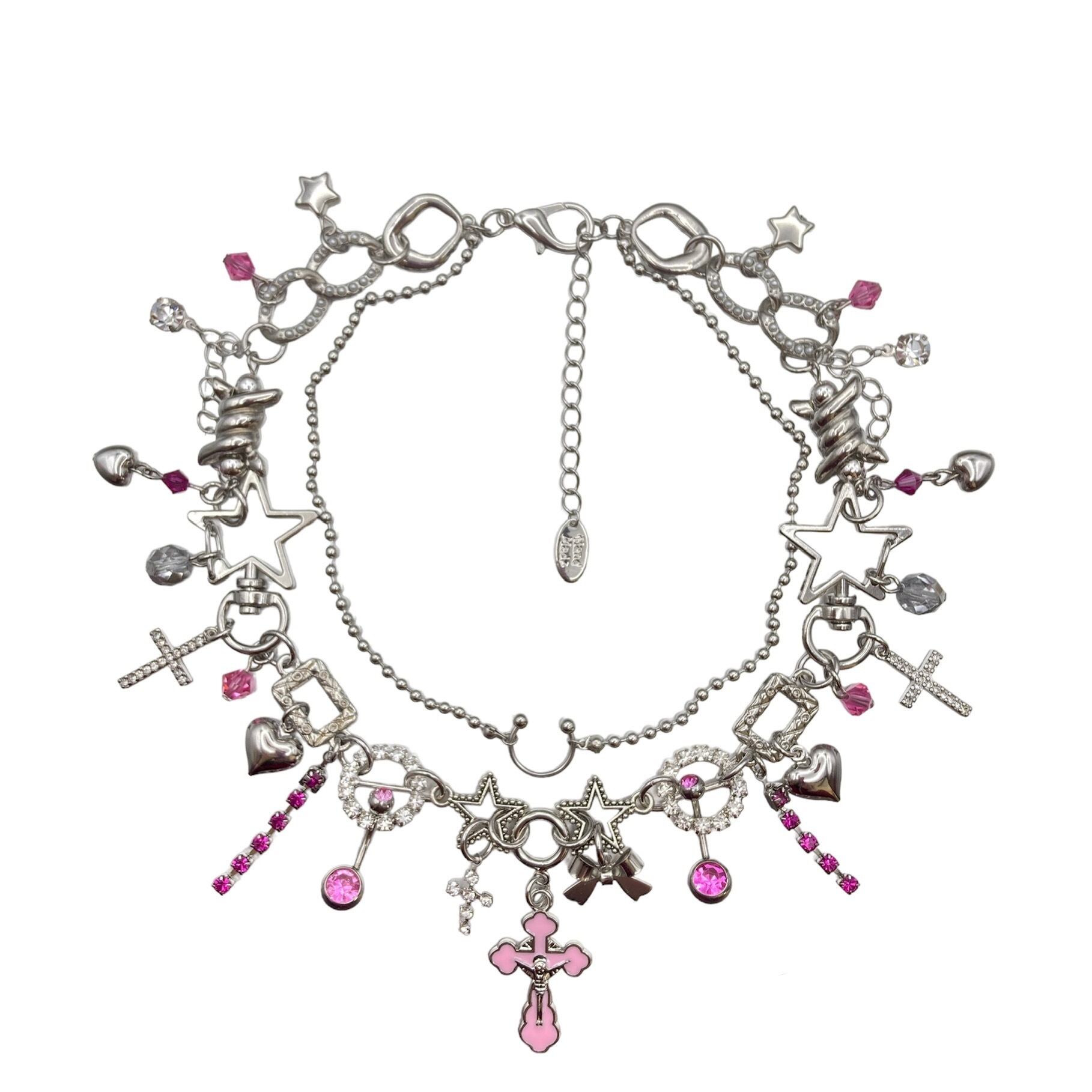 シルバーのパーツをメインに、アクセントで入ったピンクのパーツが可愛いネックレス。