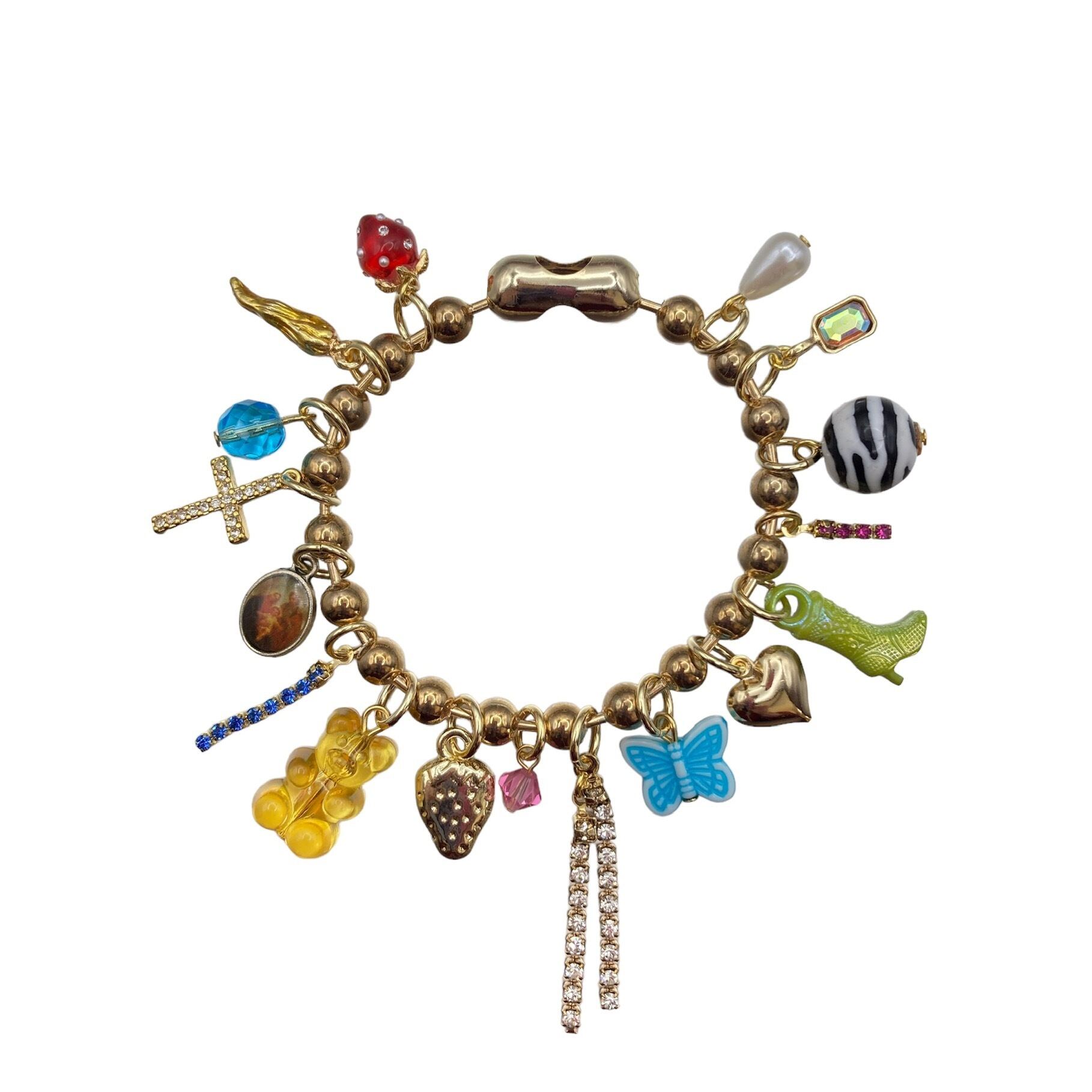 ゴールドの大きなボールチェーンをベースに個性的で可愛いチャームをたくさんつけたブレスレット。