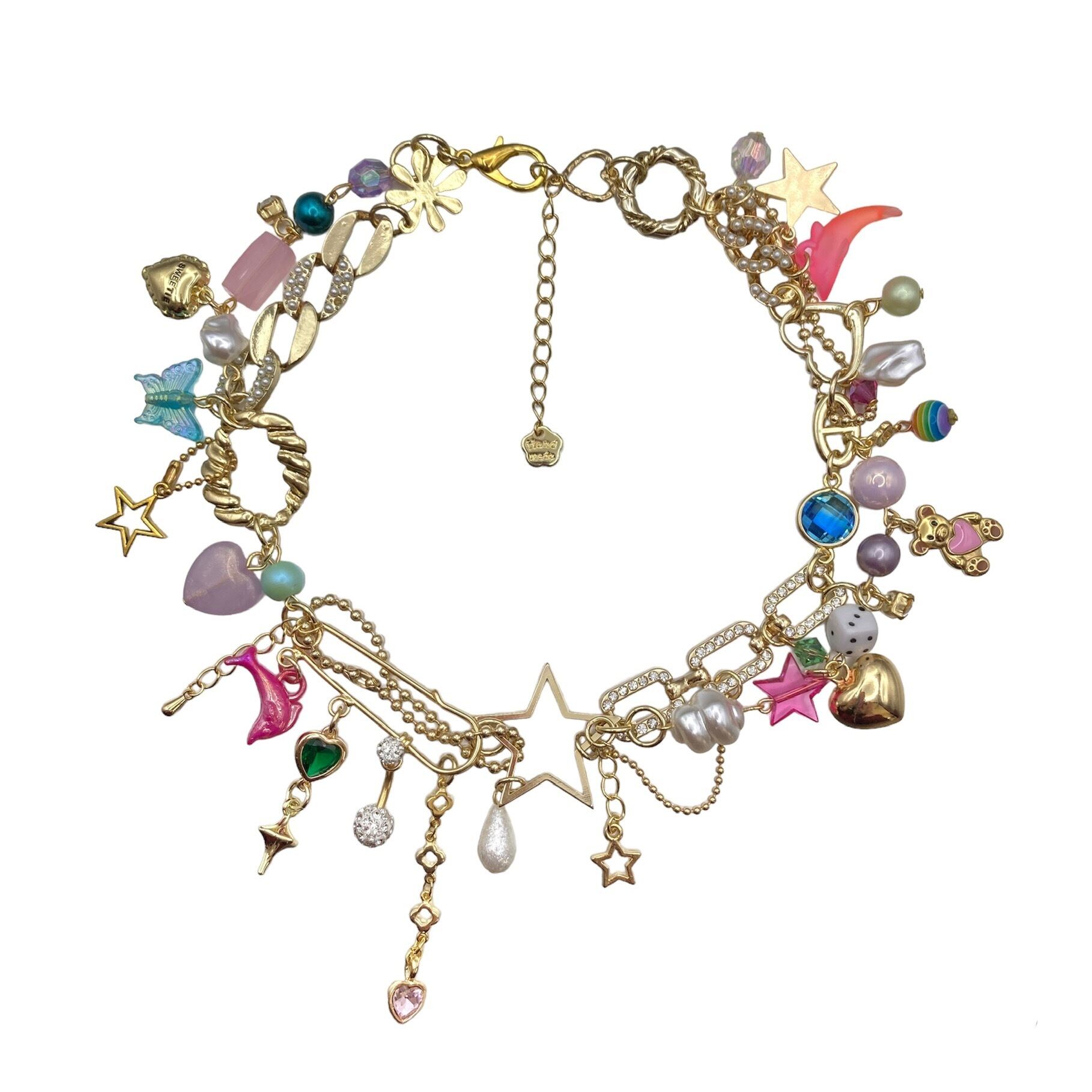 ゴールドのパーツをメインに、様々な色のパーツをつけた豪華なネックレス。