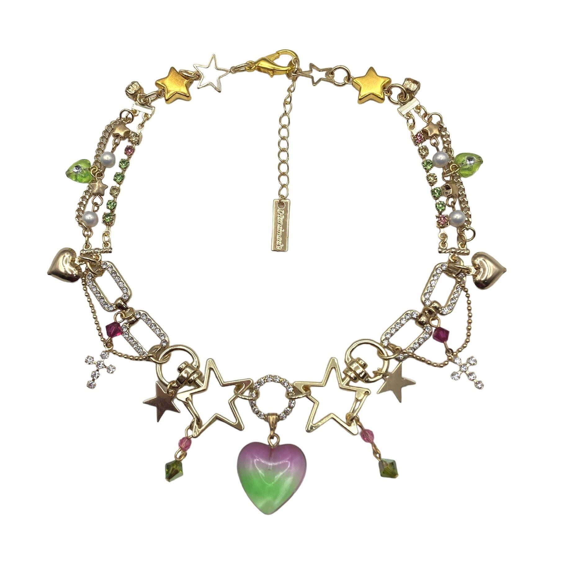 ゴールドのパーツをメインに繋げ、ピンクと緑のハートパーツが可愛らしいネックレス。