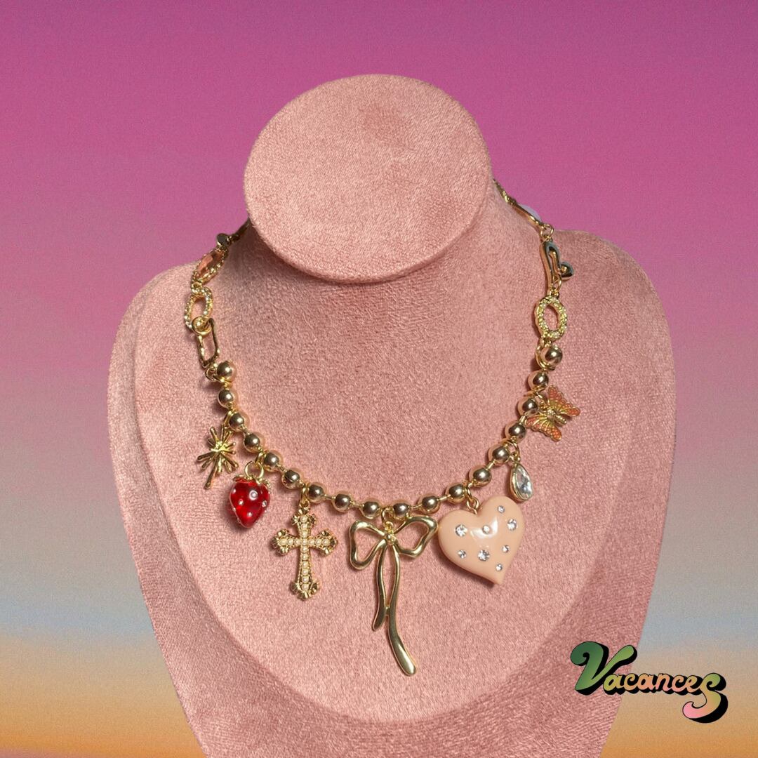ゴールドの大きなボールチェーンに、リボンやクロス、苺のチャームなどが付いている可愛らしいネックレス。