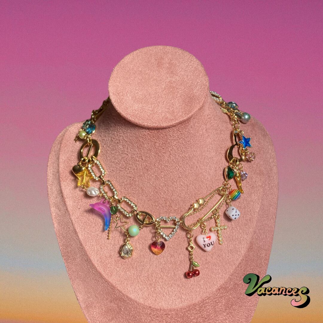 ゴールドのパーツをメインに繋げ、個性的で可愛いチャームをたくさんつけたボリュームのあるネックレス。